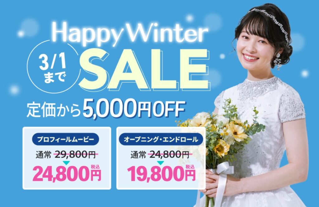 現在、ナナイロウェディングでは、ウェディングムービーを大幅割引してもらえる『ハッピーウィンターセール』を実施しています。